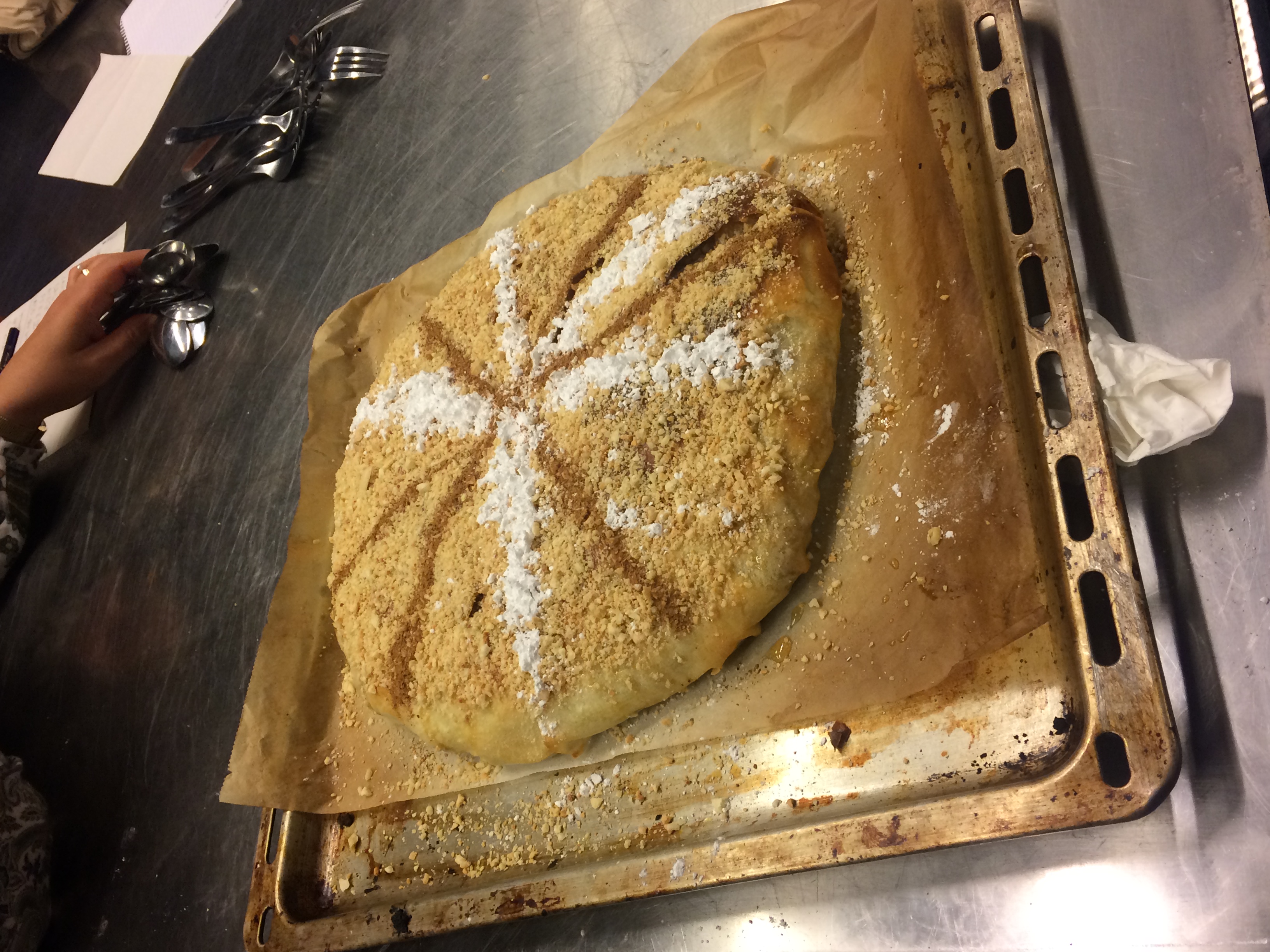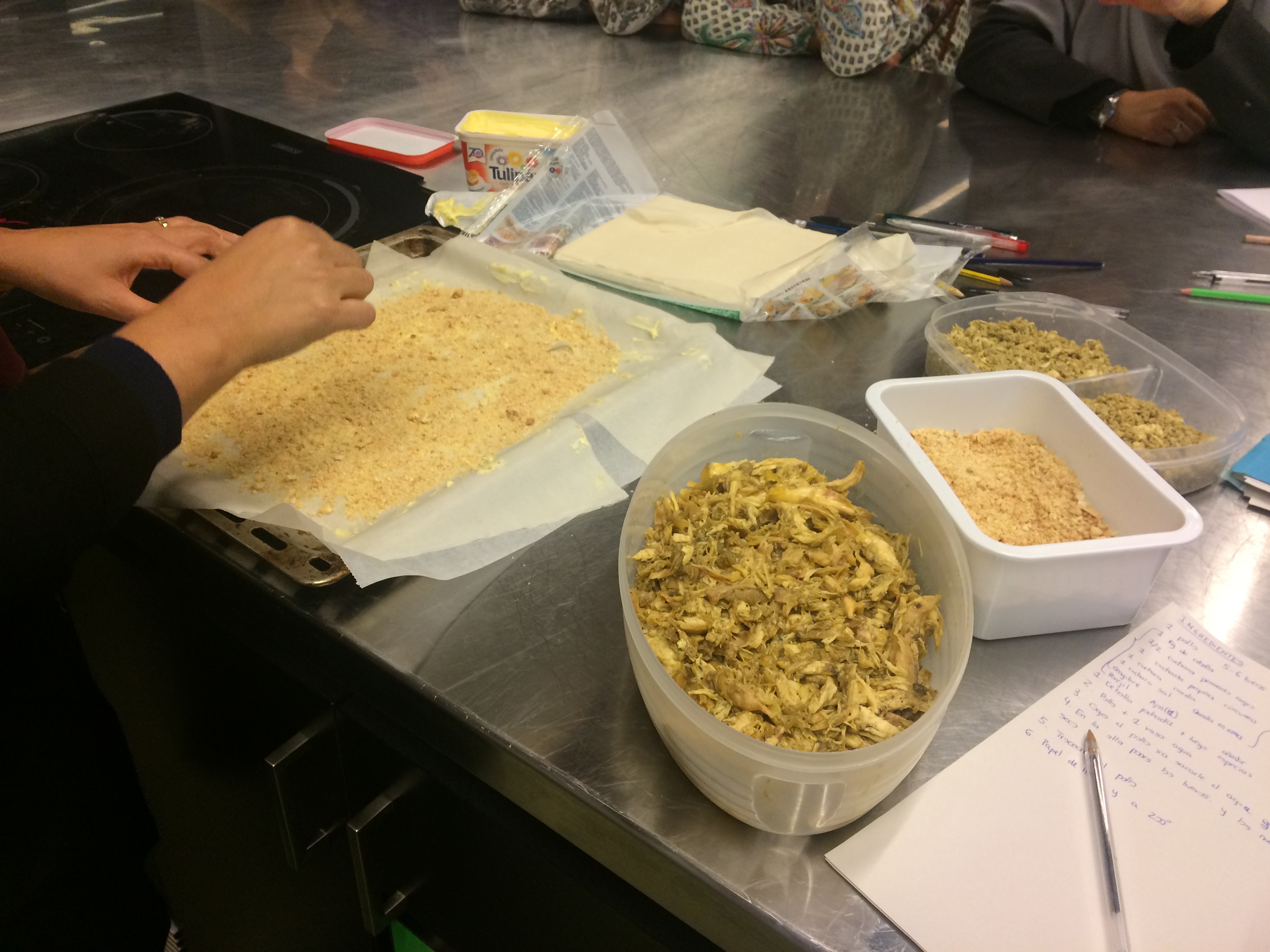 Pollastre, ceba, espècies, pebrot, canel·la en rama, cúrcuma, pasta de fil, sucre glass, ametlla picada, julivert, ous, alls, oli i sal. Hem fet els diferents passos i, després de fregir la ceba i fusionar-la amb el pollastre i preparar els ous, hem fet capes de pollastre, ous, i ametlla picada fins a cobrir-ho amb la mateixa pasta de fil. Quinze minuts al forn. Ho hem rematat amb mantega, ametlla mòlta, sucre glass i mel. I no oblidem la millor part: compartir-ho! Seure juntes a taula i tastar-ho.