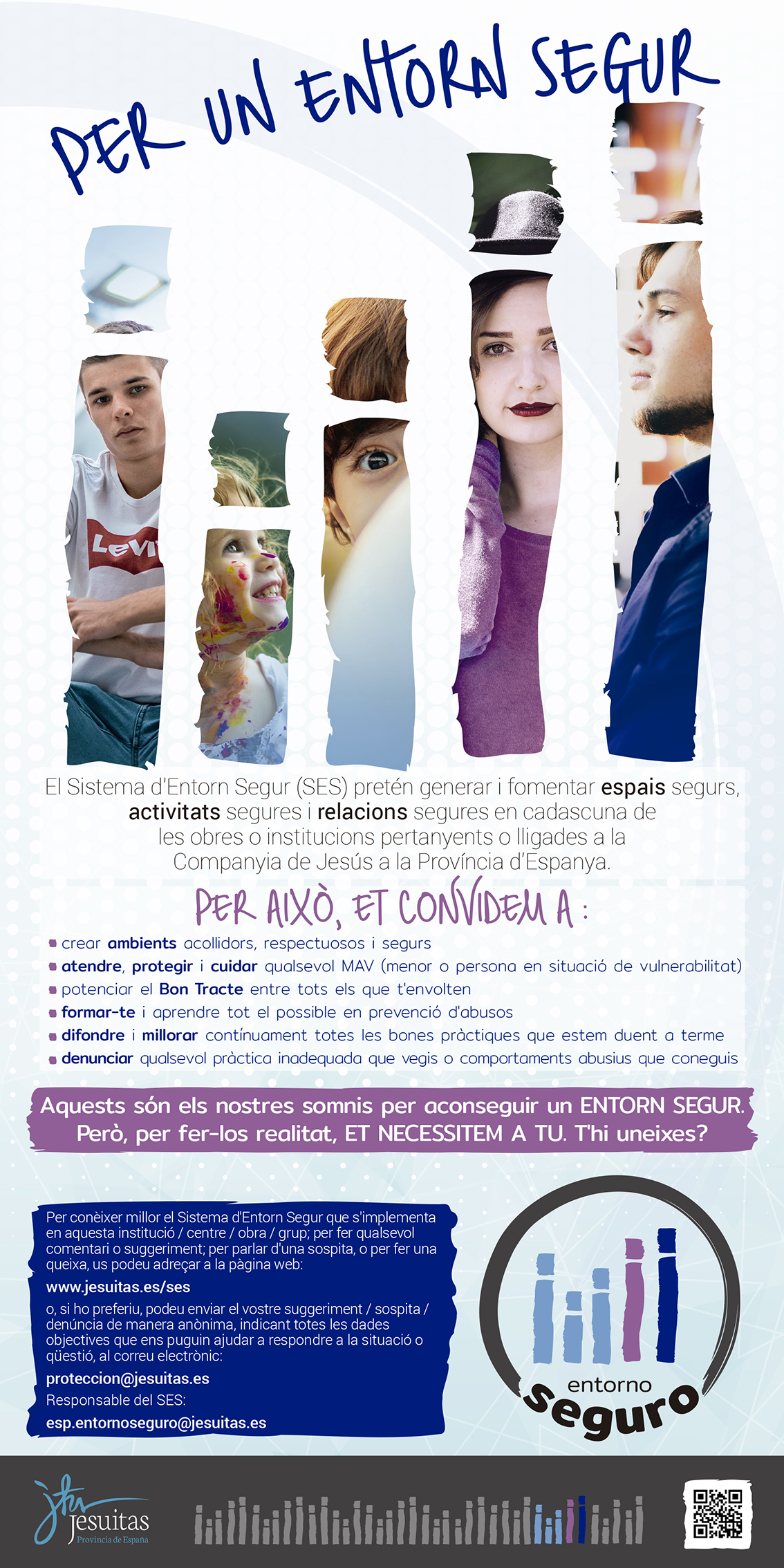 Les obres o institucions de la Companyia de Jesús a la Província d’Espanya hem iniciat una campanya conjunta per vetllar que els espais de treball i relació de les escoles, entitats socials, universitats, parròquies,... siguin entorns segurs per a les persones amb qui treballem. Així doncs, molt en la línia de la nostra #missióBONtracte, ens sumem al Sistema d’Entorn Segur (SES) que pretén generar i fomentar espais segurs, activitats segures i relacions segures.