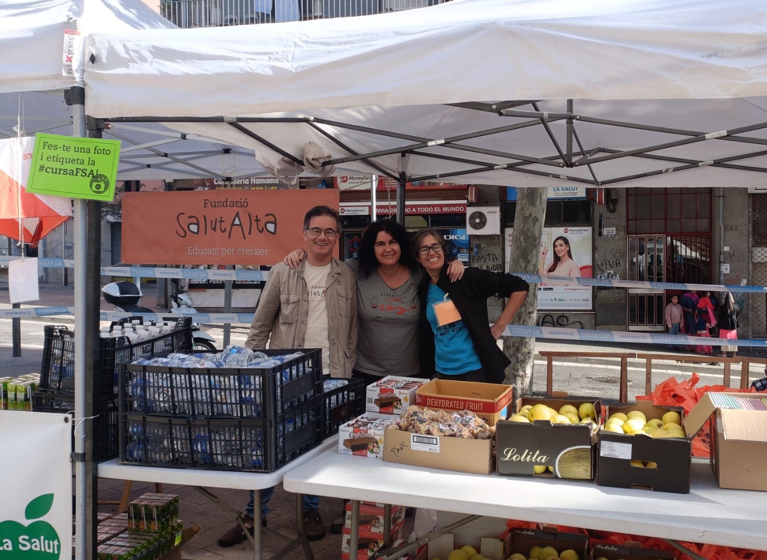 A mesura que les persones corredores arribaven a la plaça i passaven pel punt d'avituallament, podien apropar-se a la carpa de la Fundació i descobrir si havien estat premiades amb algun dels obsequis que empreses han cedit a l'entitat per a col·laborar en l'esdeveniment. Un cop acabada la cursa, vam fer entrega dels premis als millors corredors de cada categoria, amb un lot que incorporava un diploma dissenyat per la Marwa, una adolescent del projecte A100, un clauer fet a mà per la voluntària Loli i diferents productes lliurats per organitzacions col·laboradores.