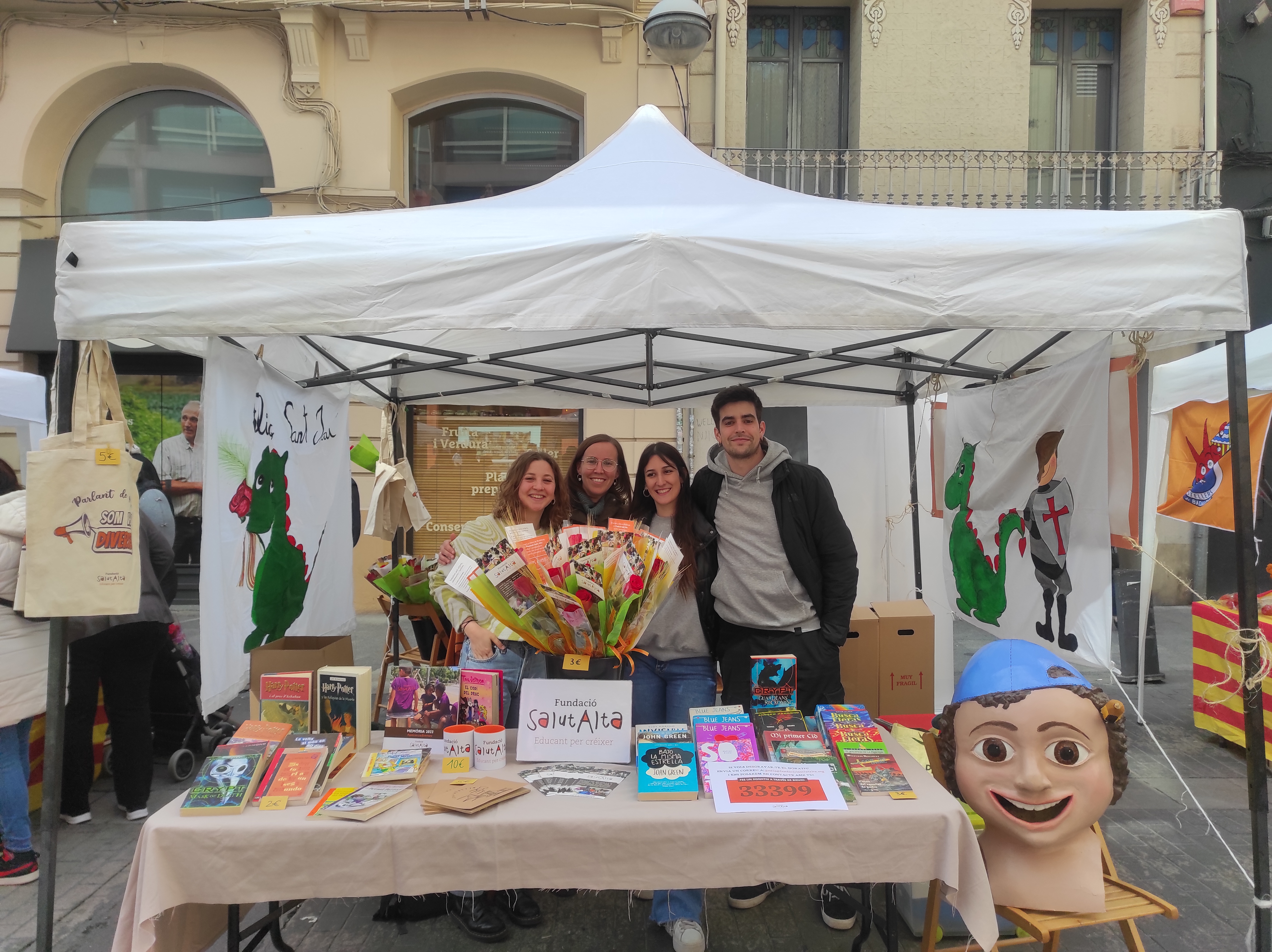 Hem venut roses i llibres de segona mà per a finançar la sortida de final de curs dels i les adolescents d'A100. El grup fa mesos que organitza la sortida i en acabar l'institut s'ha afegit a la paradeta per col·laborar en la venda de productes.