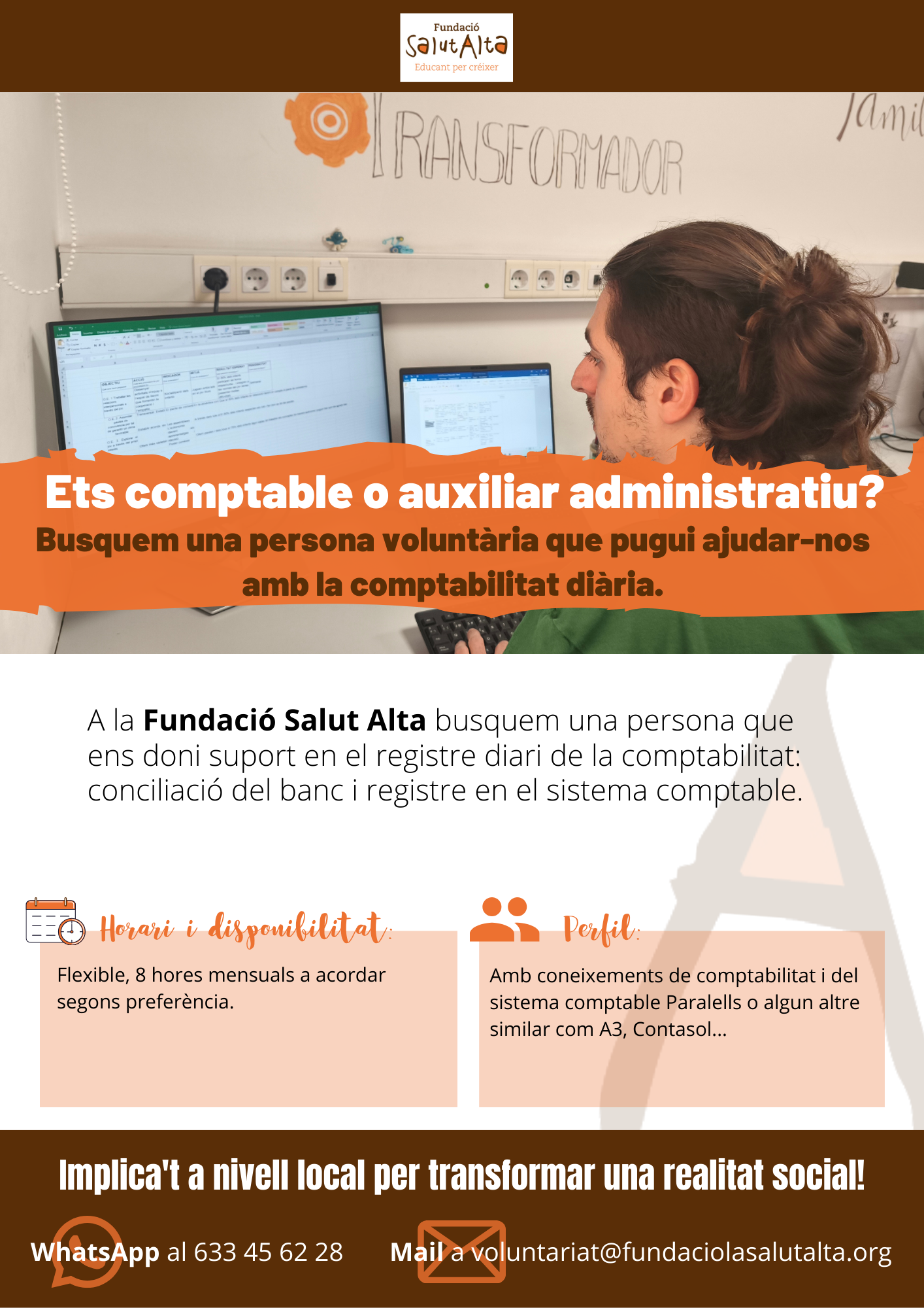- Busquem una persona voluntària que pugui ajudar-nos amb la comptabilitat diària.