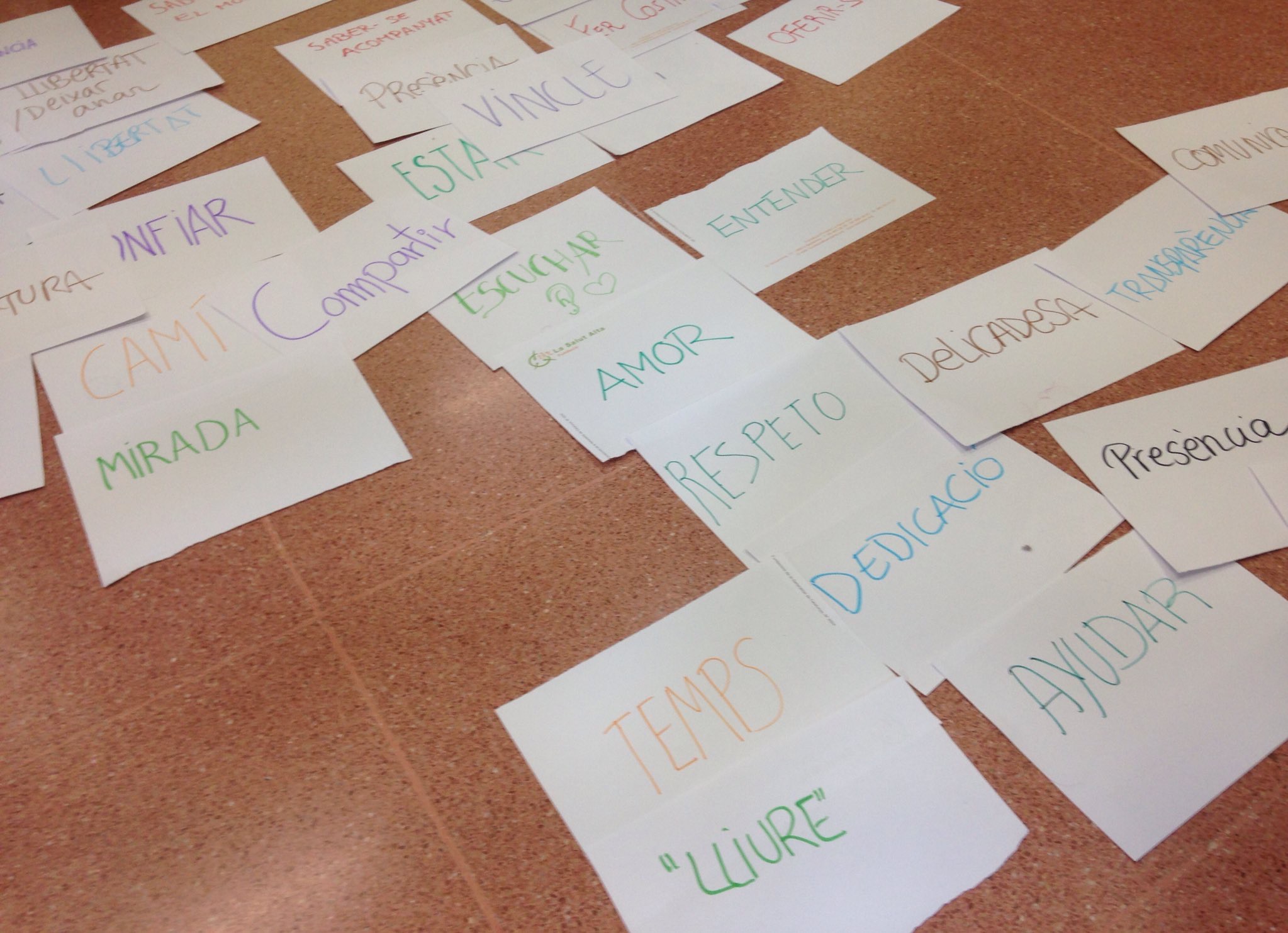 Así pues, con todo el equipo educativo y el voluntariado de la Fundación hemos hecho un ejercicio para definir qué entendemos por acompañar y cómo queremos que sea el acompañamiento que se ofrece desde la Salut Alta. Como se puede ver, son muchos los conceptos que se han recogido. Palabras muy llenas de contenido a nivel individual, que todavía toman más fuerza en contacto entre ellas.